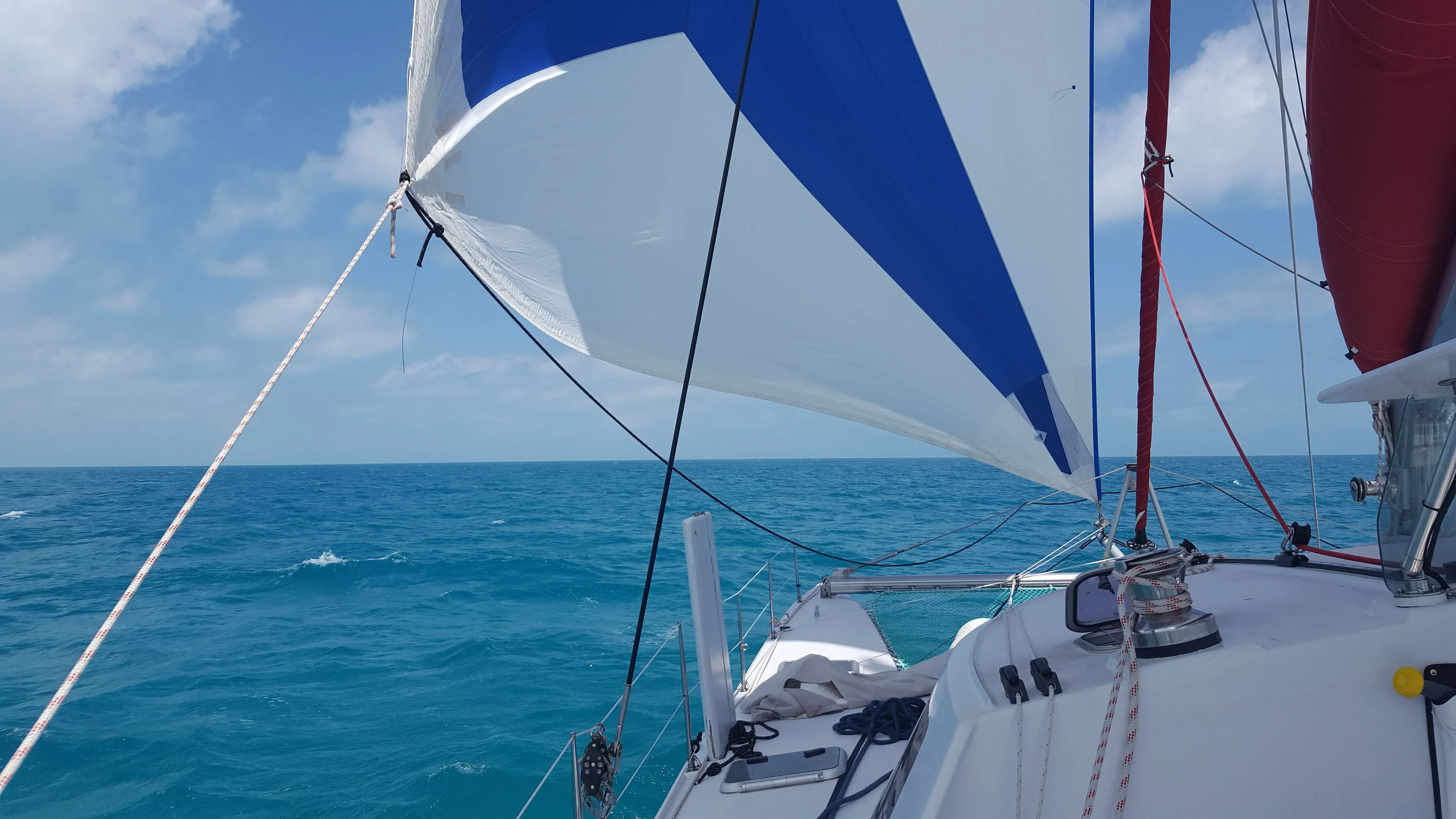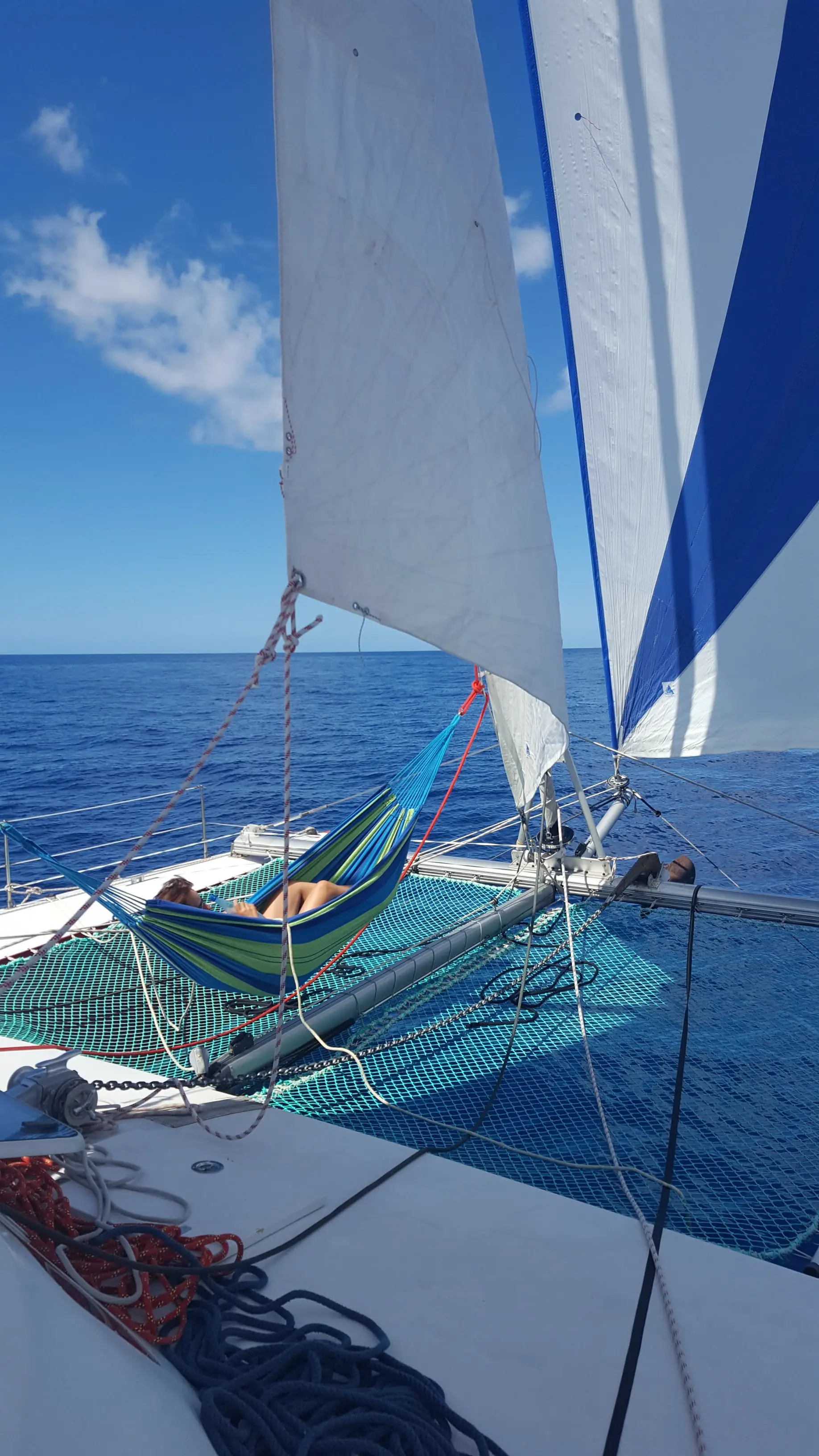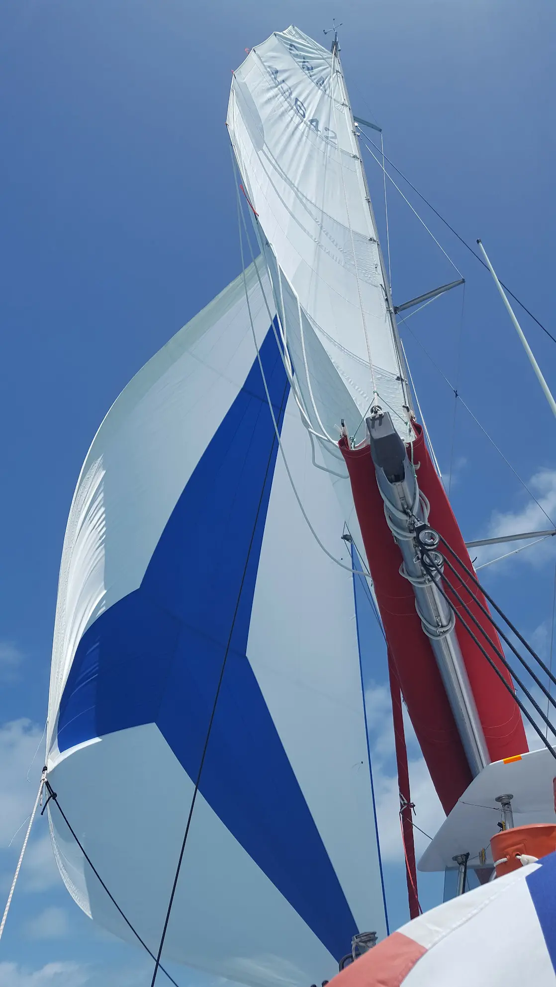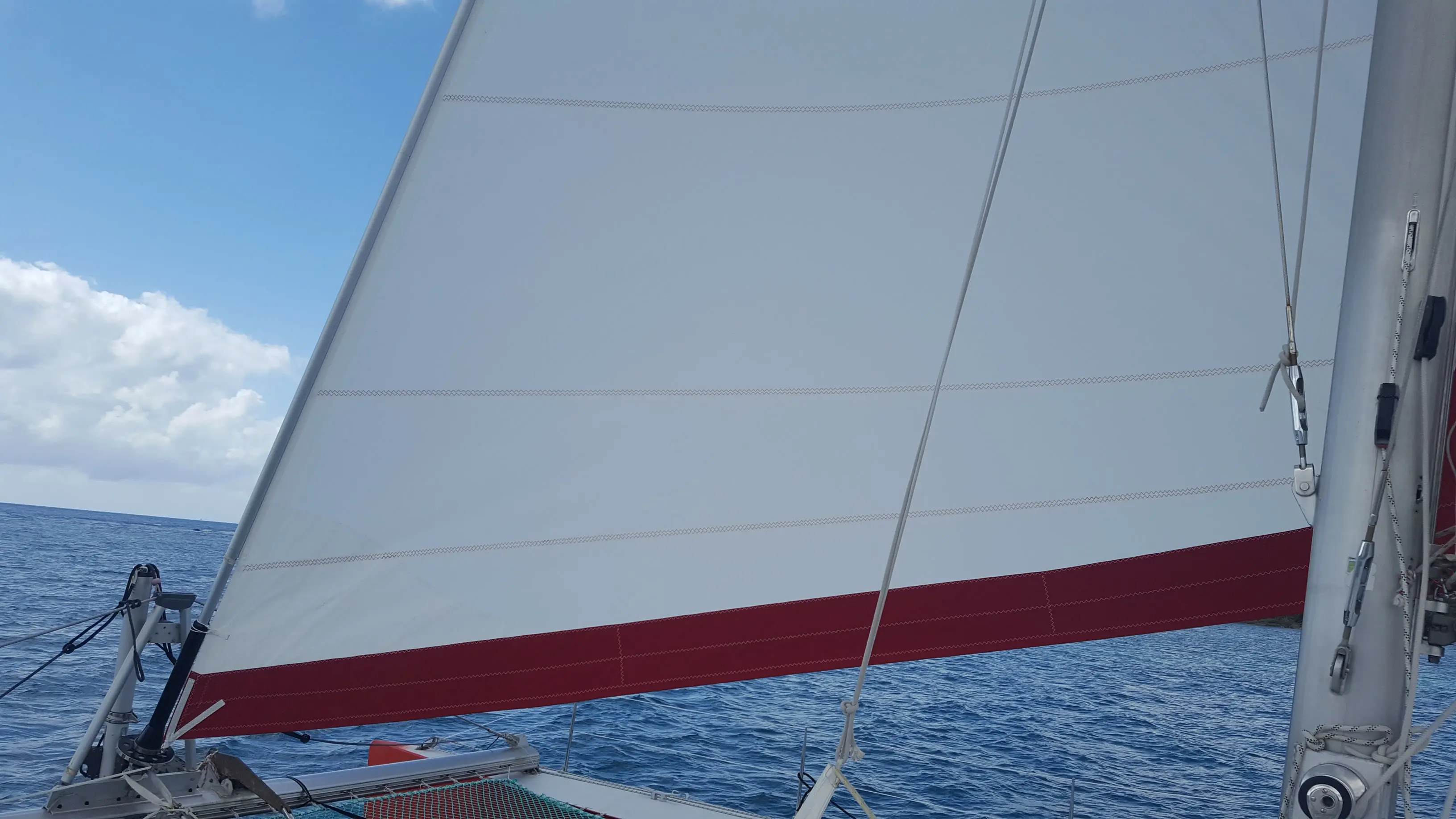 GAMME «Grand-Large» avec un ris. Nerf de chute et nerf de bordure, œillet inox sur sangles aux points, mousquetons textiles (Velcro sur sangle polyester avec passant inox), penons et bandes de visualisation du creux, hissée sur étai largable, gréé derrière le génois. Etai largable textile cordage âme Vectran avec gaine Dyneema téflonnée, (7 tonnes rupture) épissures hautes et basses sur cosses inox barrées, et manille HR Wichard en tête. La trinquette peut rester à poste dans son sac fixé au trampoline, prête à être envoyée.