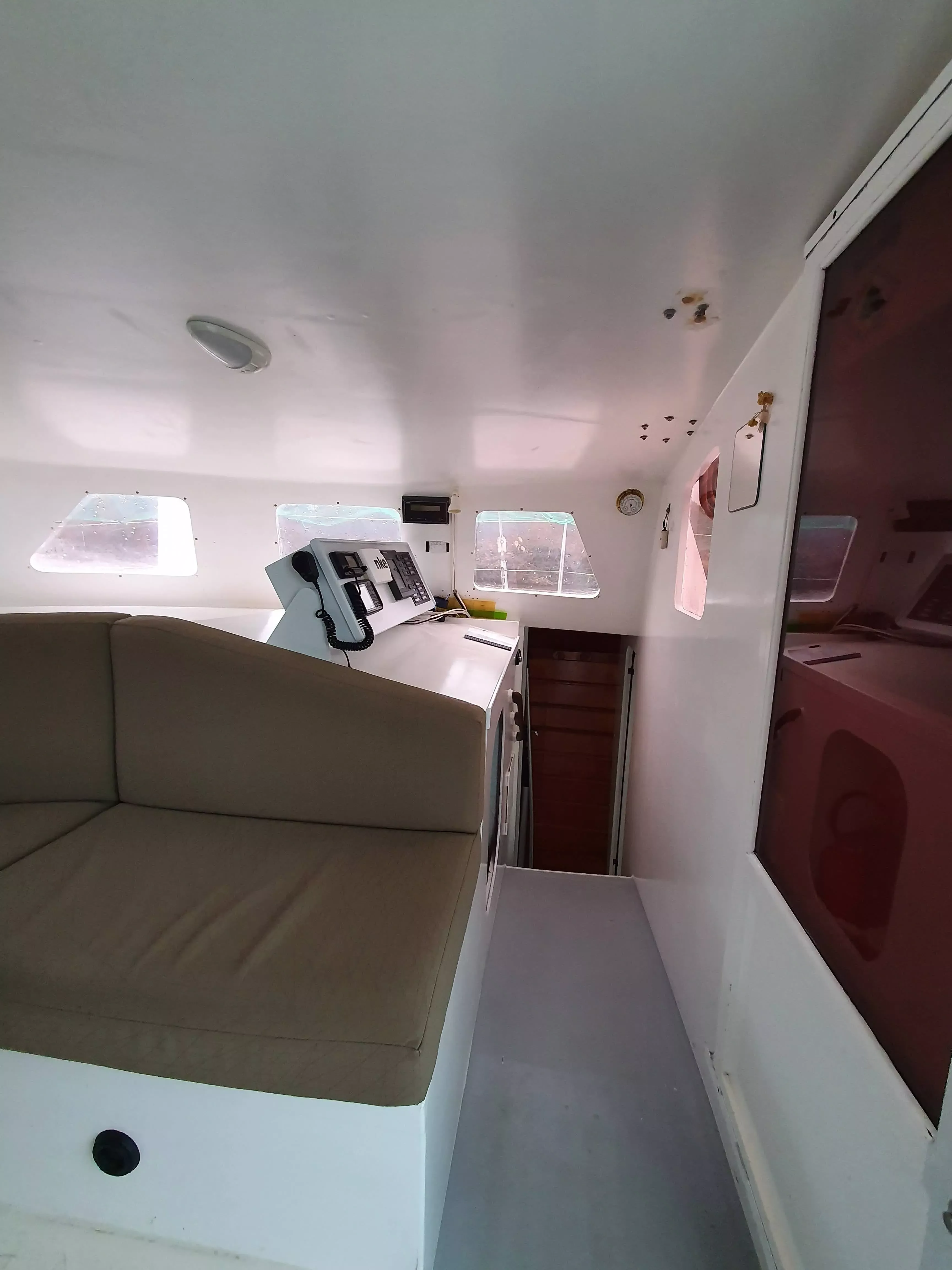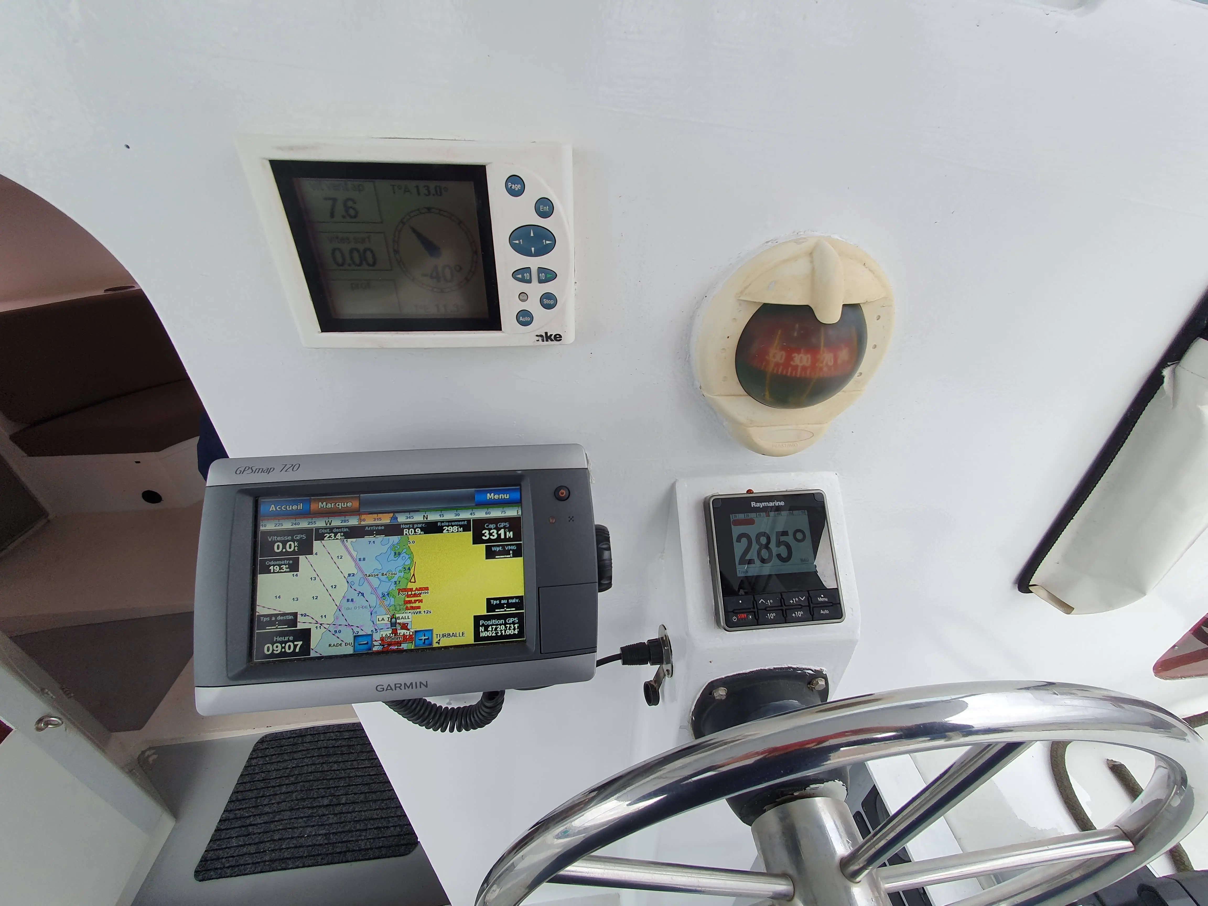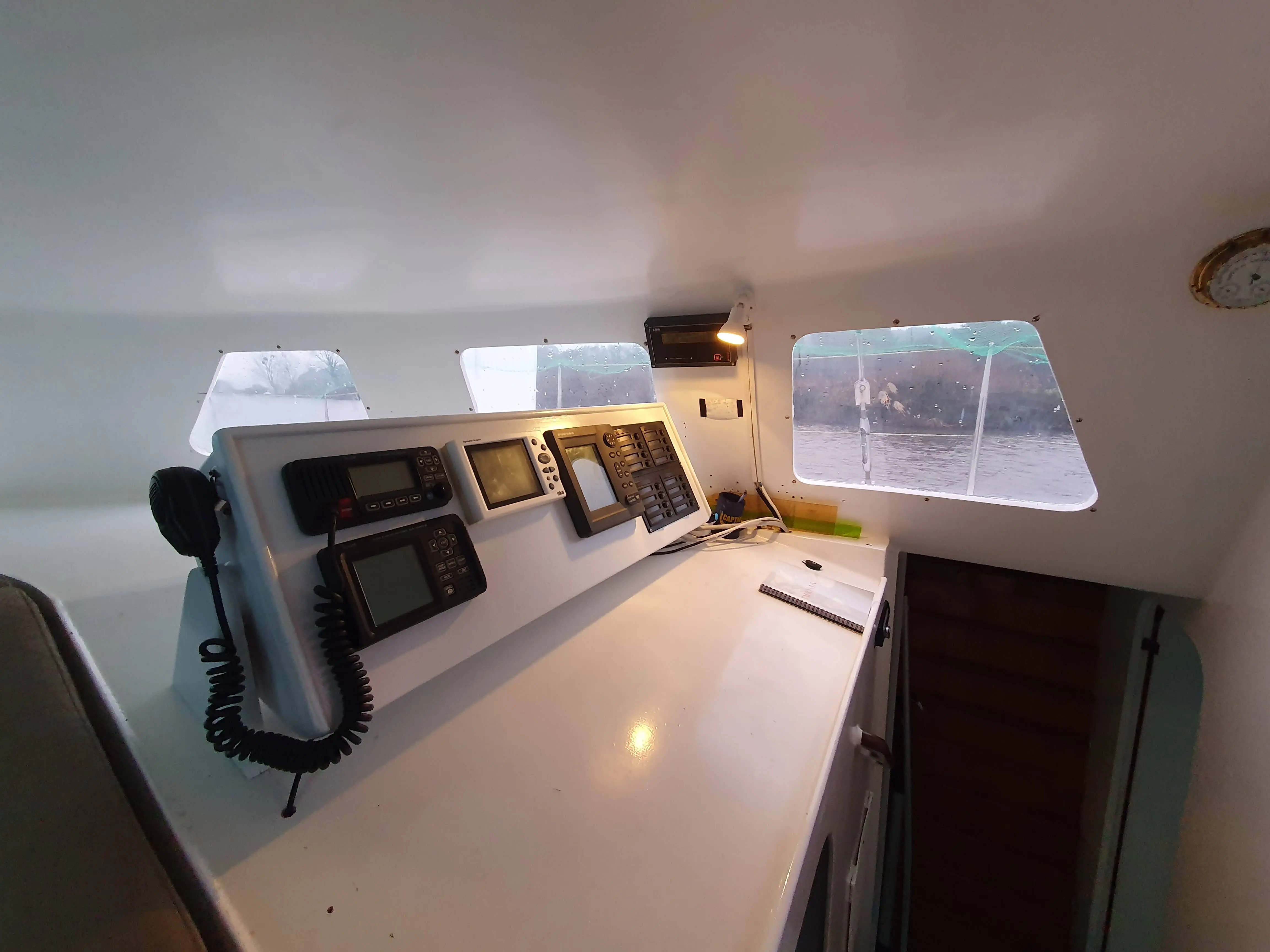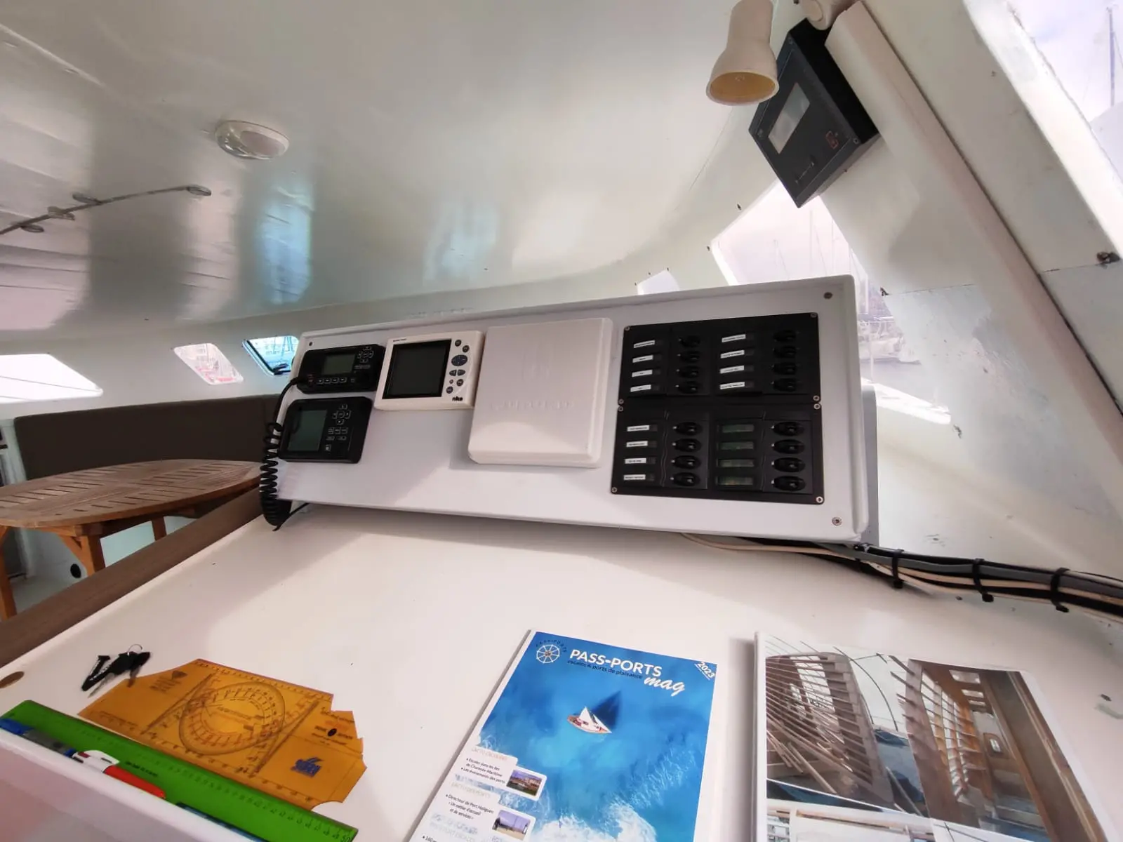 • 1 console sur la table à carte regroupant : VHF, AIS, Pupitre NKE, Radar, Commandes des feux de navigation et instruments, liseuse, éclairage blanc et rouge. Une carte marine peut être glissée sous la console. Un ordinateur portable peut être posé devant la console.