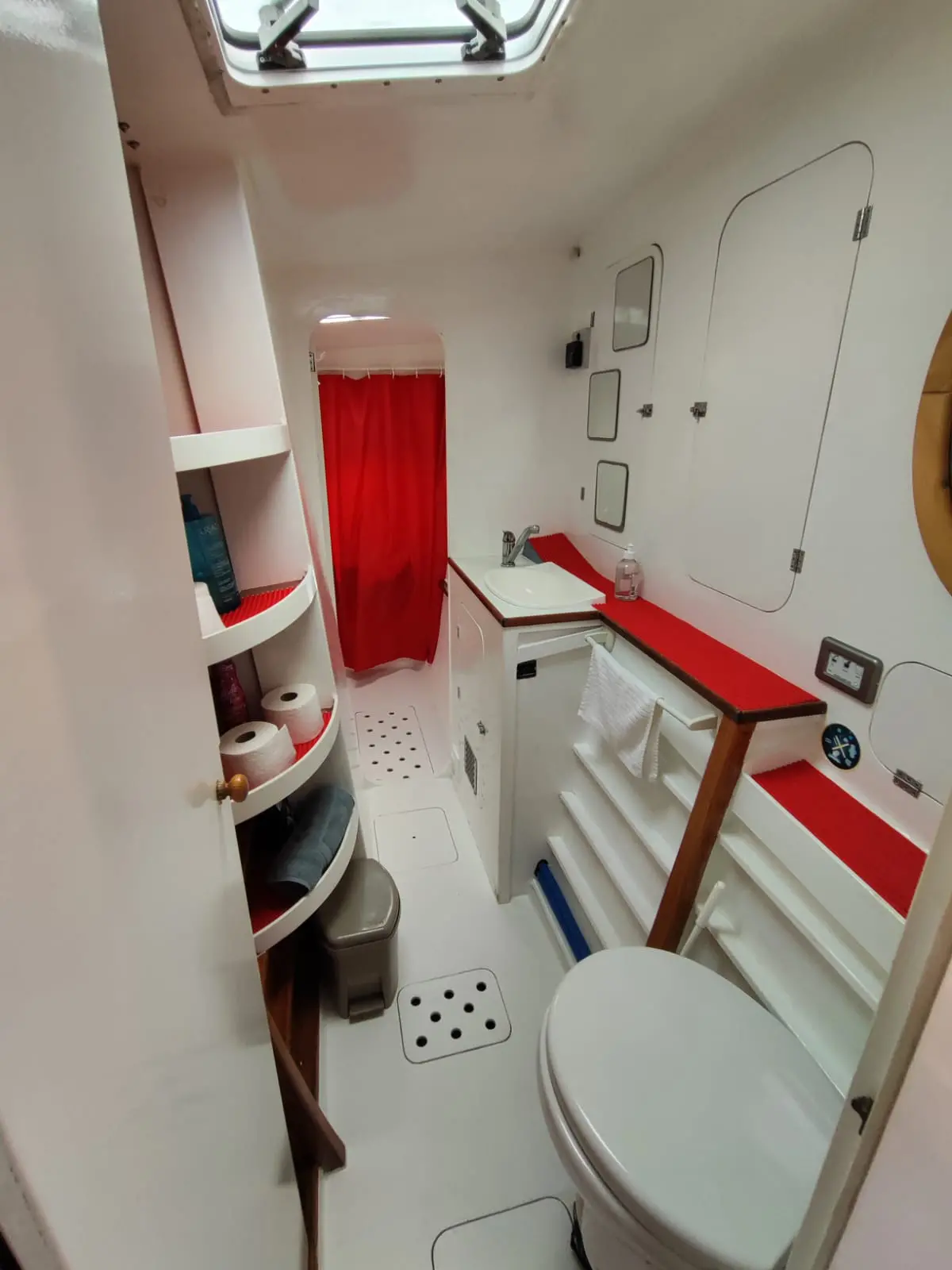 • Une salle d’eau avec douche séparée, WC électrique broyeur SFA, lavabo à Babord + Un cabinet de toilette avec WC marin, lavabo et douche ( pas en service), à Tribord