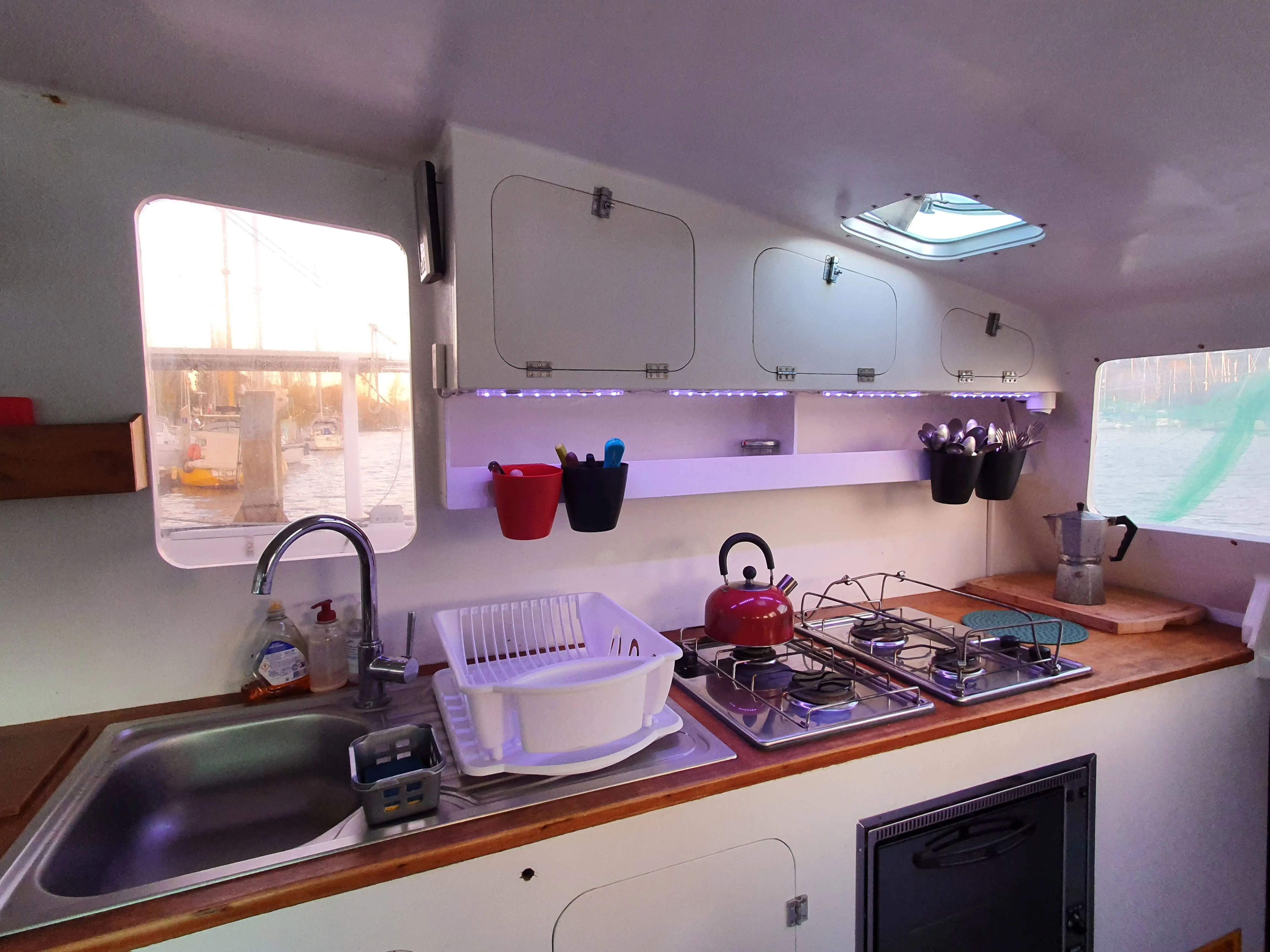 • Une cuisine équipée avec 2x2 feux inox gaz, four à gaz, frigo 12V/220V. Evier inox avec mitigeur. Plan de travail.